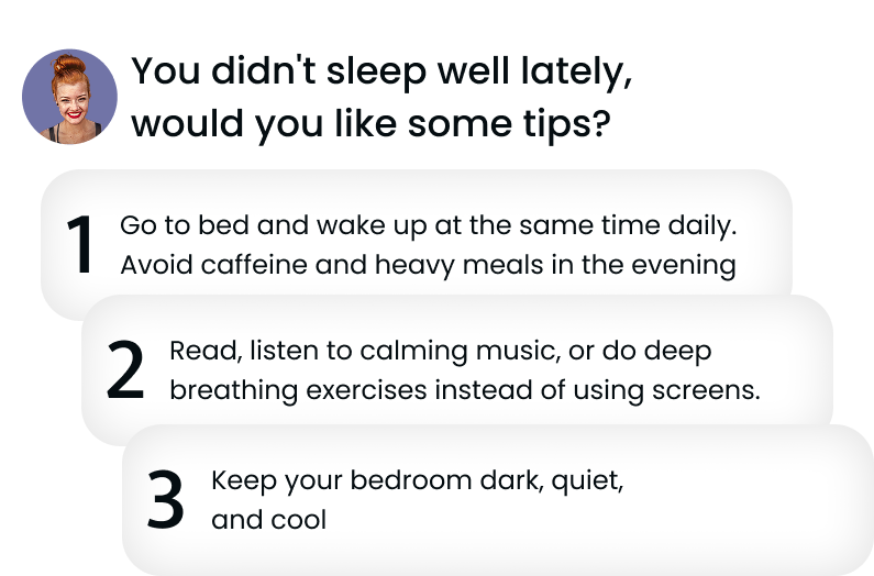 From sleep improvements to fitness tips, our AI provides customized health recommendations to help you achieve your wellness goals. Your virtual assistant adapts to your lifestyle, offering solutions that work for you.